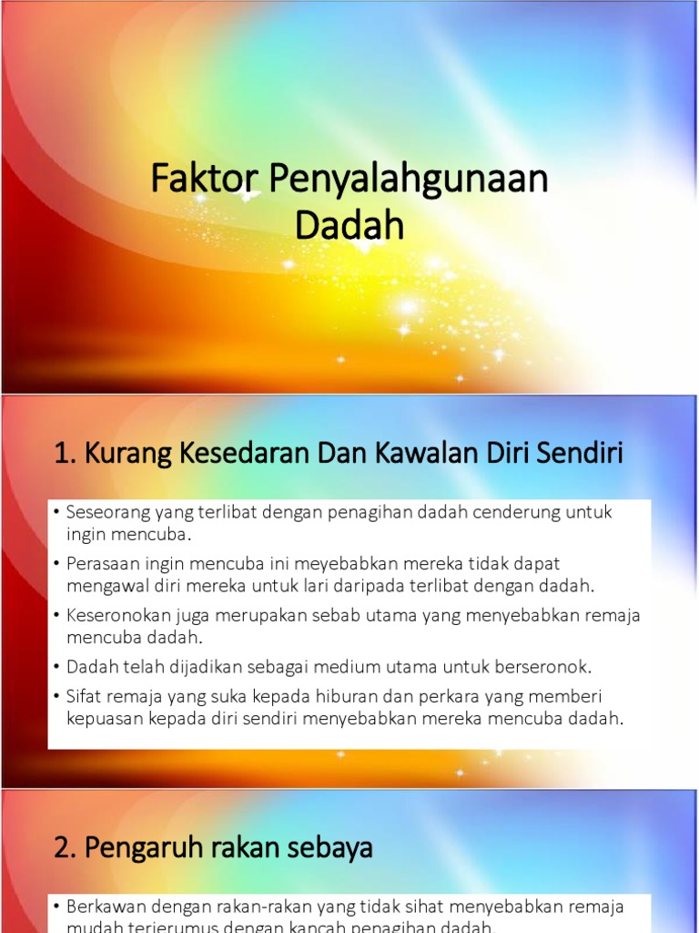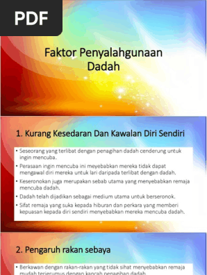 Up to 24 cash back 20 FAKTOR-FAKTOR PENYALAHGUNAAN DADAH Terdapat beberapa faktor penting atau secara umum yang telah dikenalpasti sebagai penyebab utama kepada peningkatan penagihan dadah di Malaysia iaitu faktor diri sendiri persekitaran dan masyarakat rakan sebaya sekolah dan ibu bapa. Mempengaruhi penyalahgunaan dadah di kalangan pelajar. Terdapat pelbagai faktor yang boleh meningkatkan risiko penyalahgunaan dadah.